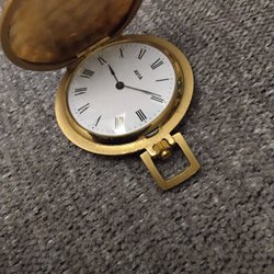 Fickur med ett mekaniskt urverk. Urtavlan är ljus med arabiska siffror och en liten sekundvisare vid klockan 6. Boetten har ett räfflat mönster på baksidan.