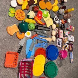 Ett set med leksaksmat i plast. Innehåller bland annat frukt, grönsaker och efterrätter.