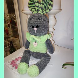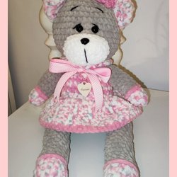 Handgjord (av mig) noggrant virkad nallebjörn. Är tillverkad av mjukt chenillegarn och har en avtagbar mössa. Pastellgrön pyjamas och nattmössan, ljusgrå kropp. Nallebjörnen är en jättesöt inredningsdetalj, dopgåva eller födelsedagspresent.