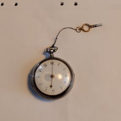 Fickur i silver med vit urtavla och arabiska siffror. Uret har en liten sekundvisare vid klockan 6. Boetten är i silver med ett mönstrat bakstycke. Urverket är synligt när boetten öppnas.