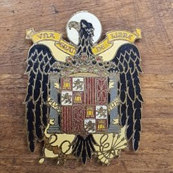 Försilvrad metall. Dekor av Zeus med Stockholm i bakgrunden, formgiven av Erik Lindberg. Diameter ca 5 cm. Tillverkad hos Vaughtons i Birmingham, i en tennlegering och gjordes i 6000 exemplar. Den delades ut till alla deltagare som var med och arrangerade OS 1912. Slitage enligt bilder.