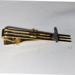 Slipsnål i metall med guldfärgad finish. Designad för att fästas på en slips.