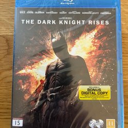 Blu-ray-utgåva av filmen "The Dark Knight Rises". Filmen är regisserad av Christopher Nolan och har Christian Bale, Michael Caine, Gary Oldman, Anne Hathaway, Tom Hardy, Marion Cotillard, Joseph Gordon-Levitt och Morgan Freeman i rollerna. Utgåvan innehåller 2 skivor.