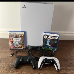 Playstation 5 med spel och 2 handkontroller
