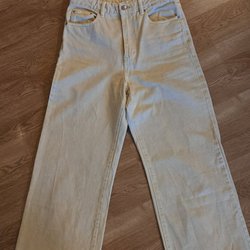 H&M gele broek, maat 34 high waist en wide legs. Een beetje stretch.