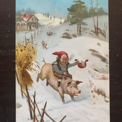 Noorse kartonnen kerstman rijdt op een varken. Gesigneerd Julius Holck