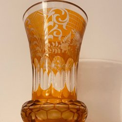VINTAGE BOHEMIAN KRISTALLEN VAAS - BLOEMMOTIEF AMBER - UITSTEKENDE SNEDE CA. JAREN 1860.