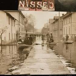 Authentieke fotografische ansichtkaart Stad in overstromingsbord Anna Sunden Vroedvrouw