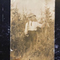 Echte fotografische ansichtkaartjager met geschoten haas en geweer