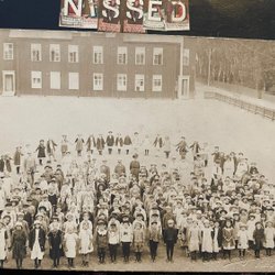 Echte fotokaarten Schoolkinderen op een schoolplein