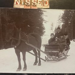 Authentieke fotokaart Familie op sleetocht na paard gestempeld PLK 223 moeilijke stempel