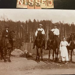 Authentieke fotokaart van 3 rijdende mannen en 2 vrouwen met paarden