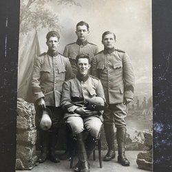 Authentieke fotografische ansichtkaart zittende militairen met militaire hoofdtooien