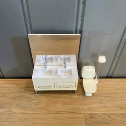 Dockkast/Poppenhuis meubels, Kaptafel Plank Afbeelding Computer Potten Strijkijzer deegroller Schaal