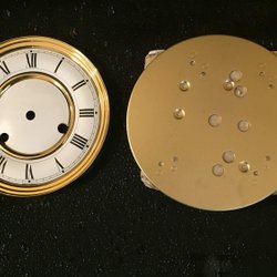 Wijzerplaat voor wandklok. Messing en gelakt metaal. Formaat: 12 cm doorsnee. Nieuw