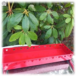 Perfecte rood gelakte blikken dienblad met uitgesneden harten kerstblad met voeten Goede staat