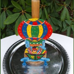 Haak met houten paneel met teddybeer die in een luchtballon rijdt