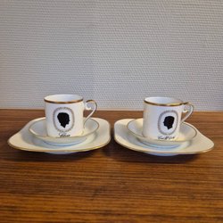 2 koffiekopjes m. schoteltje en bordjes van het huwelijk Carl XVI en Silvia, Hackefors