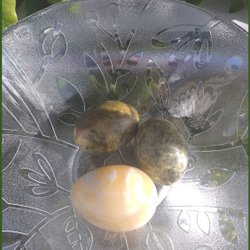 3 prachtige stenen eieren, 2 in groengrijs gemêleerd en de derde in crèmekleurig voor Pasen
