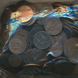 Zak met 220 bronzen munten 5-2-1 öre OSCAR II, het totale gewicht van de munten 980 gram