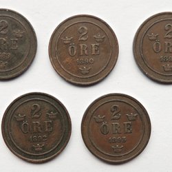 5 stuks 2 öre 1889, 1890, 1891, 1892, 1893 - Oskar II