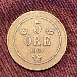 Oudere munten, Zweden. Vijf öre. Brons 1907. Oscar II.