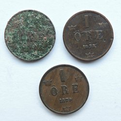 3 stuks 1 öre 1874, 1875 en 1879 - Oskar II