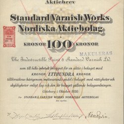 Aktiebrev Standard Varnish Works Nordiska Aktiebolag