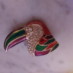 Broche Tucan Metall "Diamanter" en Groen, Rood en "Goud" L 5 cm H 3,5 cm