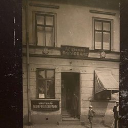 Authentieke fotokaart Schoenenreparatiefabriek en kleermaker A.F. Blomme Västerås
