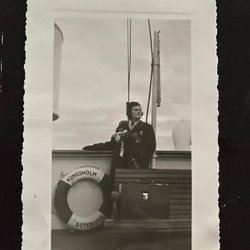 S/S Regin Rederi A-B.Svea en een boot l. v. verlaat Stockholm. Personeel bij de reling *
