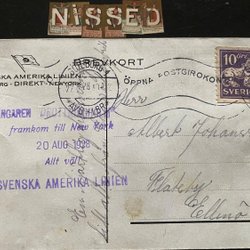 Ansichtkaart uit Ångaren Drottningholm met de groet dat het schip in New York is aangekomen