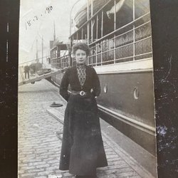 Echte fotokaart Dame naast stoomboot 1910 Emigrant