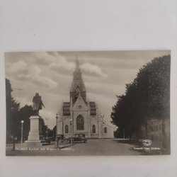 Oudere ansichtkaart van Örebro Nikolaikerk en Engelbrektsbeeld
