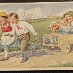 Gesigneerd K. Feiertag kind dat kind in kar trekt