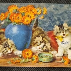 Daniël Merlijn. 3 schattige katjes Vaas met goudsbloemen. Nr. 161 blz. 6/9 1958