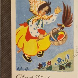 Doris Klaine Lindholm. Meisje dat op de bezem vliegt met een mand met eieren