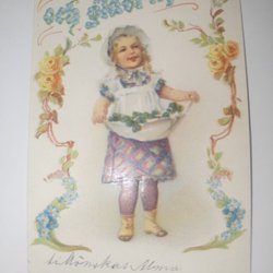Kind met grote bloemenmand. Hartelijke felicitatiekaart, gestempeld Kärrgruvan