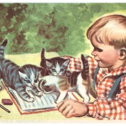 2 oude wenskaarten met motieven van goed geklede jongetjes met bloemen, kleur ca. 1905