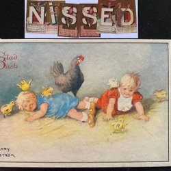 4 kleinformaat paaskaarten met kindermotieven gesigneerd JENNY NYSTRÖM jaren 50-60