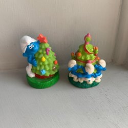 Twee Smurf-figuren met kerstviering. Smurfen en kerstboom.