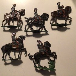 Vijf antieke tinnen soldaten te paard. Tinnen figuur. Tinnen soldaat.