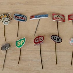 10 verschillende benzinepins, pins uit de jaren 60. Pinnetjes uit de zestiger jaren. Goede conditie.