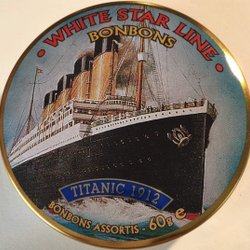 Blikje TITANIC. ONGEOPEND met snoep, uit FILM PREMIERE JAAR 1997. 7½ x 2½ cm