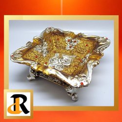 askfat, askkopp in goud- en zilverkleur met bloemmotieven en rode details.