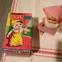 MECHANISCHE PEUTERBABY, TOEWIJZINGSBALK IN DOOS, ONGEBRUIKT. GEMAAKT IN JAPAN, Jaren 60