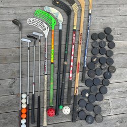 Golfclubs, floorball sticks, hockey sticks en pucks