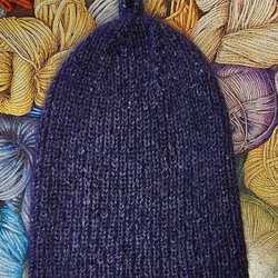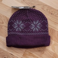 Twee gebreide mutsen in roze, groen en paars, één voor volwassenen en één voor kinderen, handgemaakt