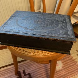 antieke houten schrijfkist met snijwerkdecoratie