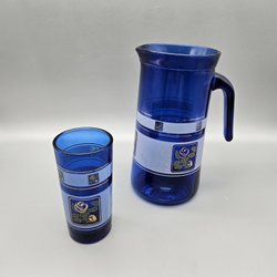 Kan met glas - karaf drinkglas blauw patroon - retro vintage